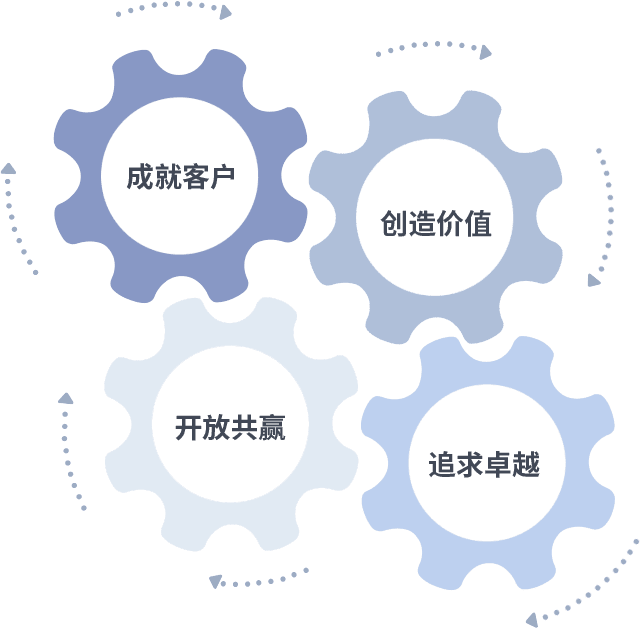 成就客户是一切决策的出发点,,创造价值是衡量所有工作的标准,,,追求卓越是我们做事做人的态度,,开放共赢是我们的格局也是最终的结果。。价值观的齿轮环环相扣,,,,推动着组织里的每个人不断向前。。。。